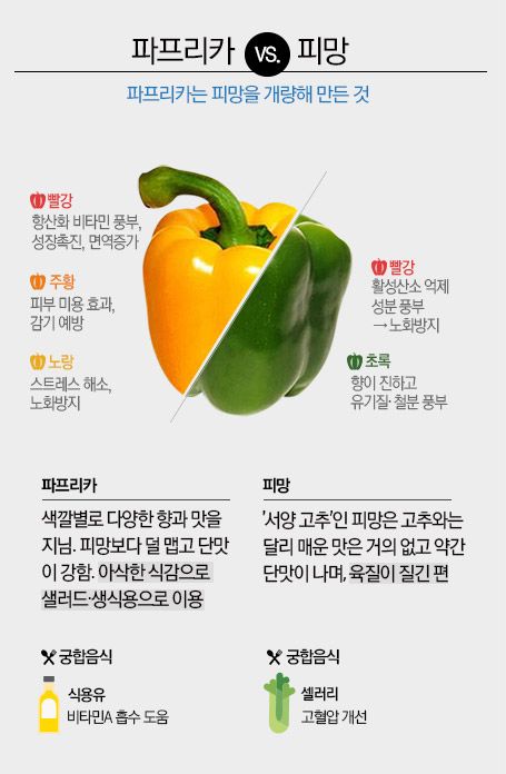 파프리카와 피망은 생김새가 비슷해 구별하기 어렵습니다. 그래서 피망을 사용하여야 할 때 파프리카를, 파프리카를 사용해야 할 때 피망을 대신 쓰는 일도 생깁니다. 이 둘은 어떤 차이가 있을까?