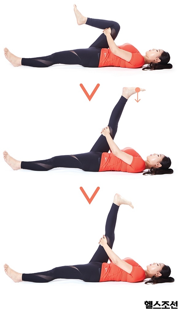 누워서 다리를 들어 올리는 자세는 허벅지 안쪽 근육의 힘과 유연성을 길러줍니다. 우선 평평한 바닥에 누워 한쪽 다리를 들어 올리고, 양손으로 무릎 뒤쪽을 잡습니다. 그 상태에서 숨을 내쉬면서 무릎을 최대한 폅니다. 그리고 발끝을 가슴 쪽으로 당겨 허벅지 뒷근육이 팽팽해지게 합니다. 이 동작을 4~5회 반복하며, 양쪽 다리를 번갈아 3세트 진행합니다. 이때 들어 올린 다리의 반대쪽 다리 뒤꿈치는 바닥을 누르게 하고, 어깨에 힘이 들어가지 않도록 하며 어깨 사이를 적당히 띄워야 합니다.