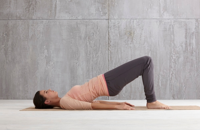 브릿지 동작은 엉덩이 근육을 강화합니다. 브릿지는 똑바로 누워 무릎을 세우고 엉덩이를 들어 올리는 자세입니다. 우선 누운 상태에서 무릎은 90도 각도로 구부리고, 발바닥은 바닥에 붙인 채 다리를 골반 넓이보다 약간 넓게 벌립니다. 그리고 허리의 C자 곡선을 유지합니다. 무릎에 힘을 주지 말고 항문을 조이듯 엉덩이 근육에 힘을 주면서 그대로 엉덩이를 들어 올립니다. 5초간 유지한 다음 척추를 분절해서 하나씩 내린 후, 엉덩이를 내리면서 천천히 조인 힘도 풀면 됩니다. 이 과정을 10~15회 반복합니다. 이때 엉덩이를 너무 높이 들면 척추게 무리가 갈 수 있어 주의해야 합니다. 특히 허리가 아프면 엉덩이를 땅에서 5cm 정도만 들어 올리는 게 좋습니다.