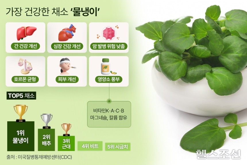 미국질병통제예방센터(CDC)가 선정한 '건강에 이로운 채소 순위'가 최근 공개됐습니다. 1위는 물냉이, 2위는 배추, 3위는 근대, 4위는 비트, 5위는 시금치가 차지했습니다. 가장 건강한 채소로 꼽힌 물냉이의 건강 효능에 대해 알아보겠습니다.