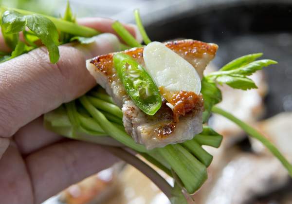 삼겹살을 먹으러 가면 미나리를 함께 구워주거나, 반찬으로 명이나물이나 깻잎 쌈 등이 나오는 경우가 많다. 이들을 함께 먹으면 맛과 식감에 매우 탁월한 조합인 것은 모두 알고 있는데, 건강